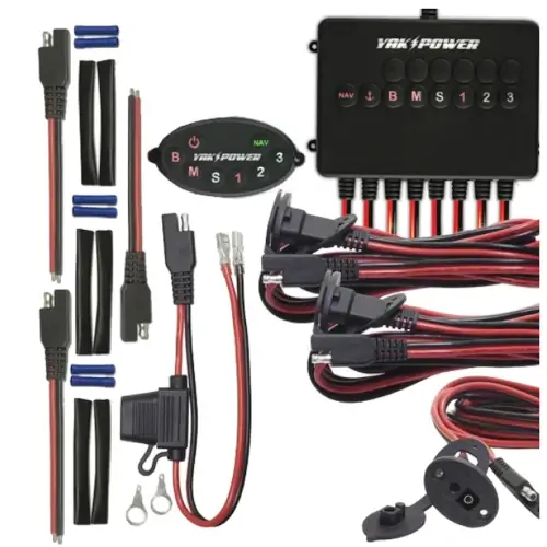 The included YP-RP8R switcher features 8 switched outlets, 12 volt powered keypad that plugs directly into the relay pack (no batteries to have to change), integrated Bluetooth with mobile app control, last memory mode, inline 15A fuse, and Yak Power plug-and-play connectivity.